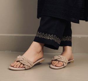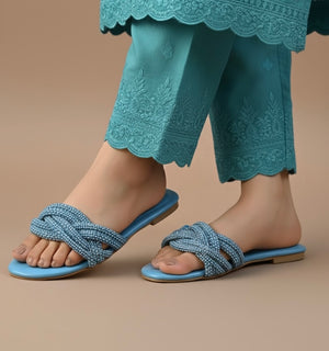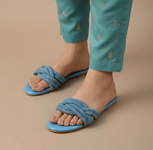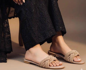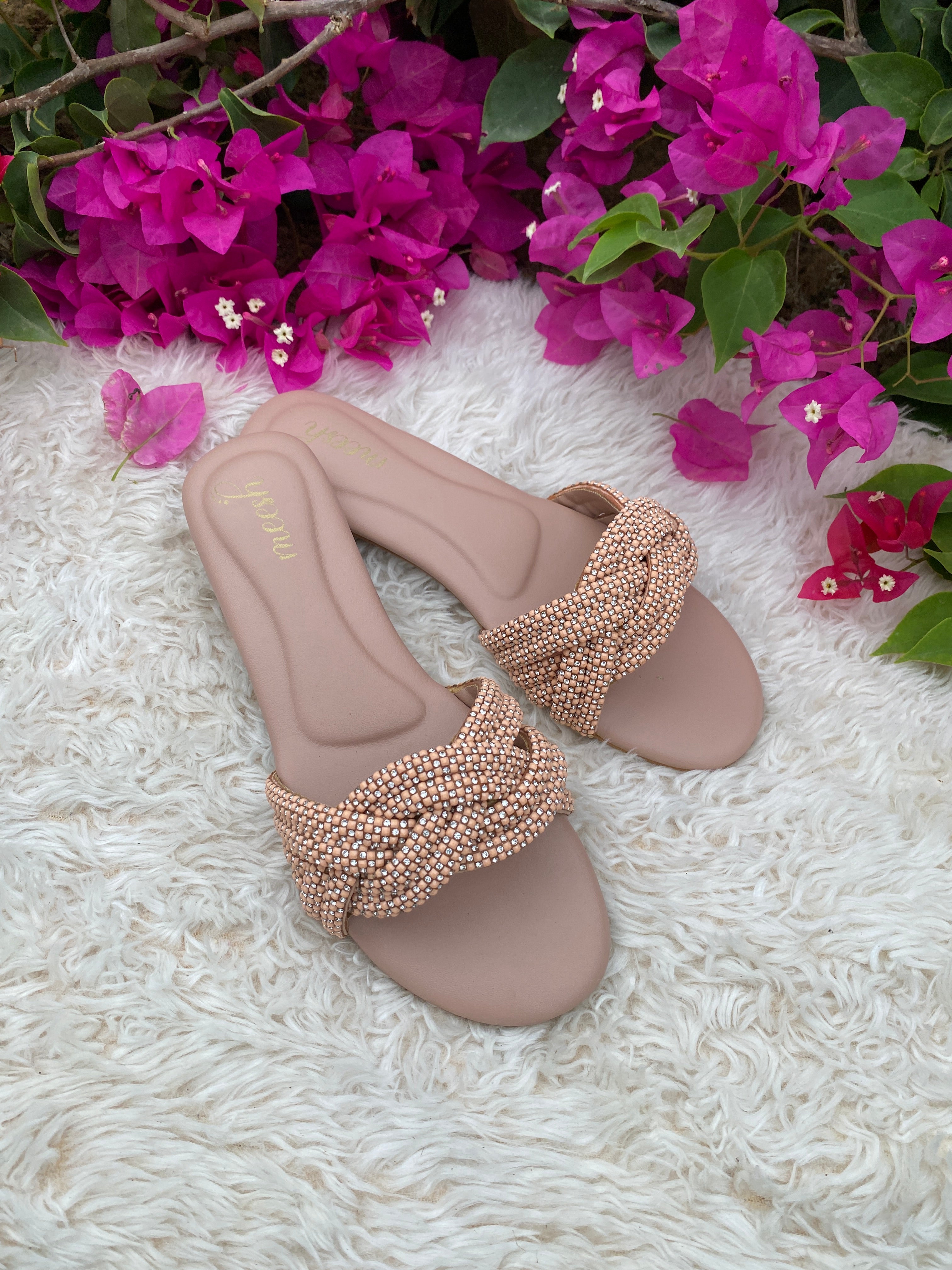 Step into effortless style and comfort with meesh luxe Flats. These stunning slides are designed for the modern woman who refuses to sacrifice comfort for fashion. Featuring a beautifully braided strap meticulously embellished with shimmering, high-quality beadwork, these flats catch the light with every step, adding a touch of glamour to any ensemble.