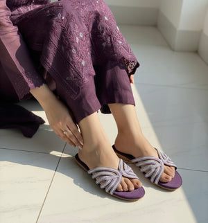 Add timeless elegance to your wardrobe with Meesh velina flats. Crafted with a refined white beaded upper and available in purple and green, these flats offer a graceful look for formal and casual wear. The classic round toe ensures comfort, while the anti-slip sole provides secure, confident steps throughout the day.